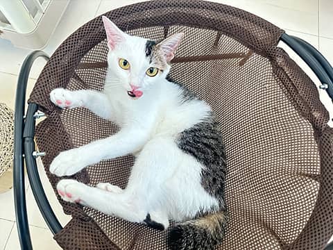 赤ちゃんの頃、母猫に置いていかれたのか屋根裏にいたところを発見され、シェルターに来ました。とっても元気に育ちました! 一人遊びも、猫と遊ぶのも上手です! 白いベルトを腰に巻いてるような柄が特徴です。