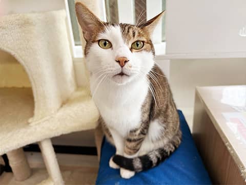 体格の良いイケメンの甘えん坊です。 温厚ですが、大きな音に驚いたりすると、強い力で人間に攻撃してしまうことがあるそうです。シェルターではおっとりした姿を見せてくれています。きらきらの瞳で甘えてきます。 撫でられ好きで、人なっつこく可愛いです。 猫が興奮してしまった際にも、落ち着いて対応してくださる里親さんを募集中です。