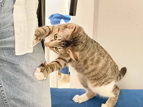 多頭飼育崩壊現場からレスキューされました。当時は乳飲子でした。 赤ちゃん時代は黄緑首輪の「きみどりちゃん」と呼んでいました。お口の周りが白いキジ白です。 とっても元気に育ちました! 人間大好きで、そばを通るとちょっかいを出してきます。